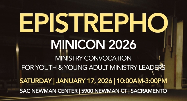 EPISTREPHO is a Ministry Convocation for Youth & Young Adult Ministry Leaders. It will be held on Saturday, January 17, 2026 from 10:00am-3:00pm at the Sac Newman Center in Sacramento. Mass will be celebrated by Auxiliary Bishop Rey Bersabal and a special presentation given by guest speaker Marilyn Santos from the USCCB. Cost is $20 per person (lunch included). Discount is available for parish groups of 10 or more.