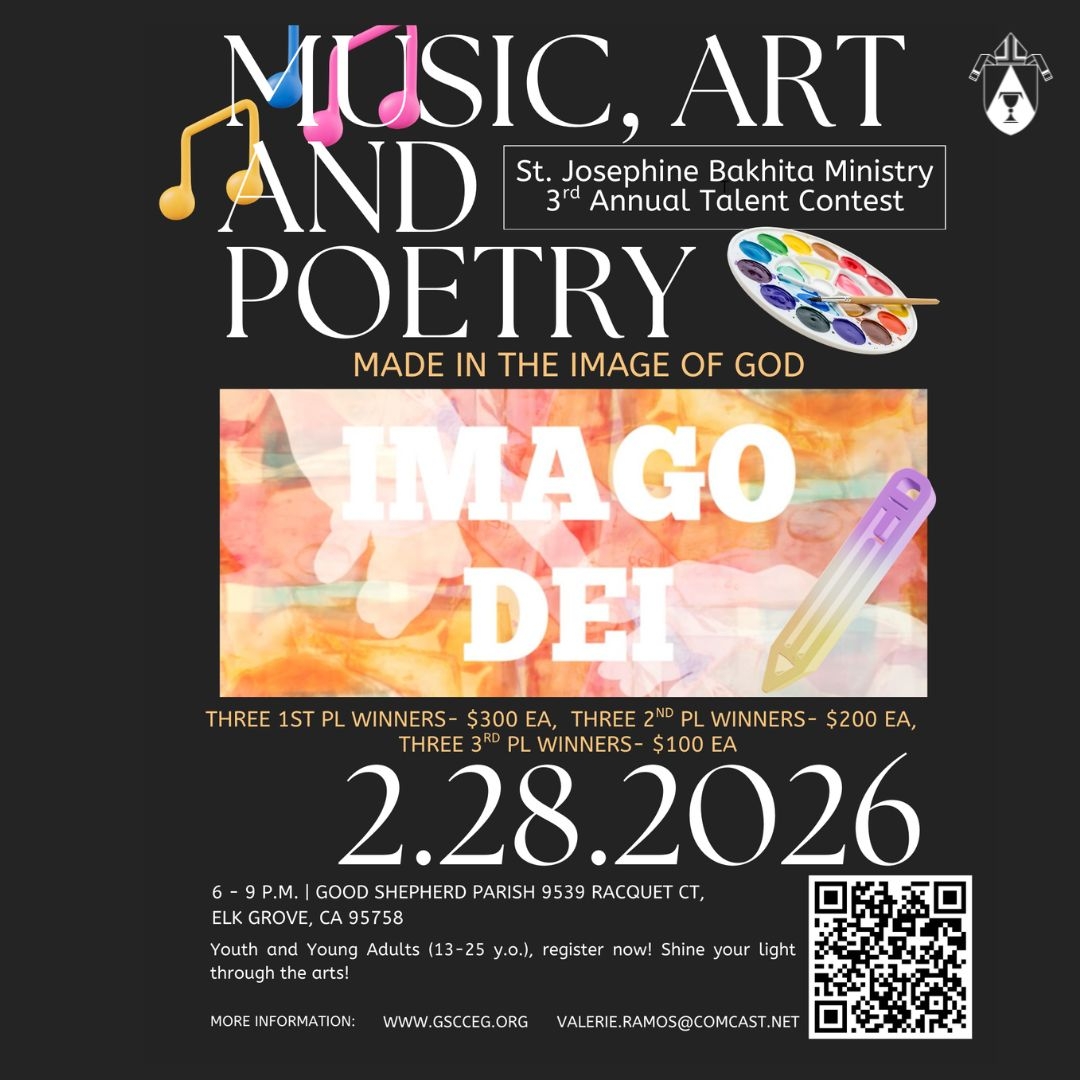 The Black Catholic Ministry Office in partnership with St. Josephine Bakhita Ministry at Good Shepherd Parish in Elk Grove invite all diocesan youth and young adults (ages 13 – 25) to showcase their artistic skills at the 2026 Music, Art, and Poetry Contest (MAP26 Contest). This year’s theme is “Imago Dei, Made in The Image of God”. Participants are invited to express through music, art, or poetry what “made in the image of God” means.