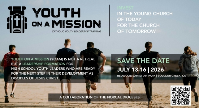 Youth On A Mission (or YOAM) is a Catholic leadership training for high school youth. YOAM 2026 is scheduled for July 13-16, 2026 at Redwood Christian Park in Boulder Creek, California. For more information, please visit: yoamnorcal.weebly.com.