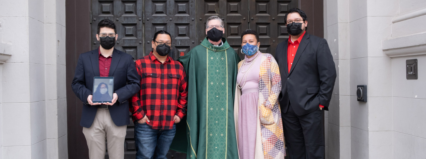 Header photo: From left, Victor Amador (with Victoria Ramos on iPad), Joseph Visitacion, Father Michael O’Reilly, Titi Kila and Ruben Arocan at the doors of the Cathedral of the Blessed Sacrament.